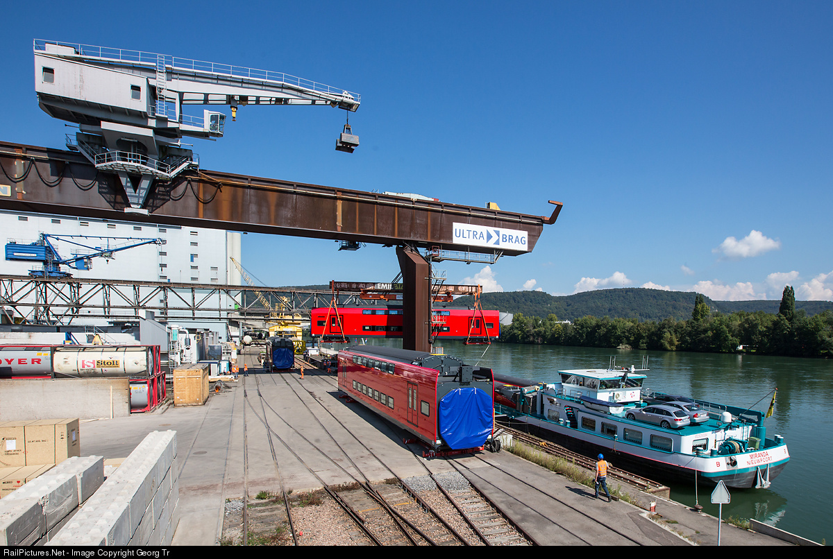 Yesterday in the "Au harbor" of Muttenz near Basel, the first six cars of the first doubledeck trainset for Aeroexpress (Moscow), built by Stadler Rail in Altenrhein/Switzerland, were loaded to the Rhine ship "Miranda", which will bring the train to Amsterdam. Then the six cars go with another ship to Mukran on Rügen/Germany, where the train is coupled together the first time in the harbor on a russian broad gauge track (1524 mm). Then it goes by railway ferry "Kaunas" to Klaipeda/Lithuania and by rail to the Stadler work in Minsk/Belarus for commisioning. In decembre 2014 the first train should be ready in Moscow for test runs. Stadler Rail will deliver a total of 25 trains, 9 with 6 cars and 16 with four cars. Only the first four trains will be built in Switzerland, the others in Minsk/Belarus. The 6 car trains will be 155 meter long, 3,4 meter width and 5,24 meter high, running up to 160 km/h with a maximum power of 5200 kW under 3000 V DC, on three different lines from Moscow to the airports of Sheremetyevo, Domodedovo and Vnukovo. The first of the two long intermediate cars is hanging on the cranes hook to be loaded in the ship. Two others intermediate cars are littler shorter but heavier, because of the drive engineering. In total 8 of the 24 axles are driven.