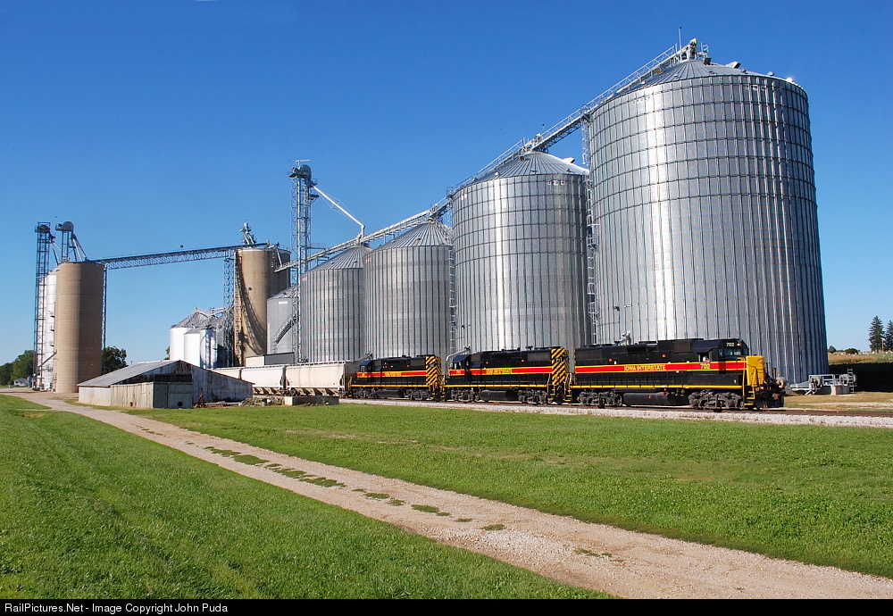 IAIS 702 leads two other locomotives south along the IAIS Peoria Sub as they pass through the grain complex in the small town of Putnam.