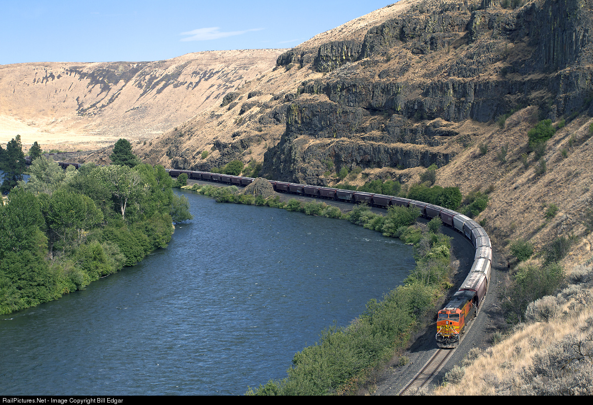 BNSF DPU 5305 gives a shove on an empty grain train as it winds its way through the Yakima Canyon between Ellensburg and Yakima, WA. This location is at the Umtanum Creek Recreation Area and a pedestrian suspension bridge allows access to this side of the river.