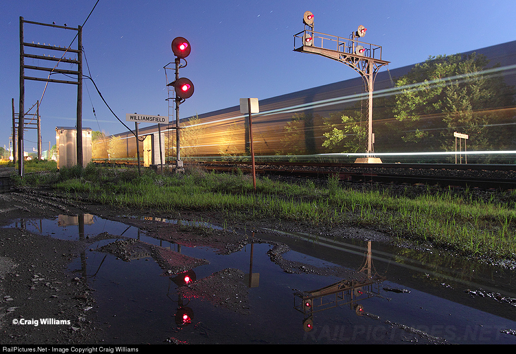 An eastbound BNSF train blast thru the small town of Williamsfield. Santa Fe cantilever style signals are still left east of the Cameron Connection in 5 places. GI, Yost, Williamsfield, Toluca, and Verona are still classic cantilever. Regular signal bridges in Santa Fe style are still up at Edelstein, West/East Chilly, and Ancona.