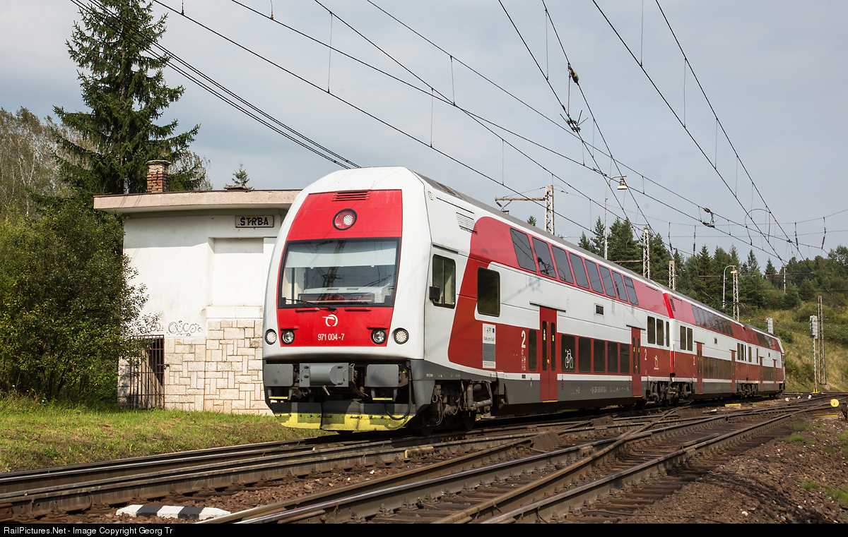 | Dual system (3000 V DC/25 kV 50 Hz AC) three car doubledeck trainset "City Elephant" (in Slovakia called "Jánošík") for 160 km/h, built by Skoda Vagonka Ostrava for the ZSSK in a series of 10, leaving Štrba with Os 7852 for Zilina, leading is cab car 971.004. |