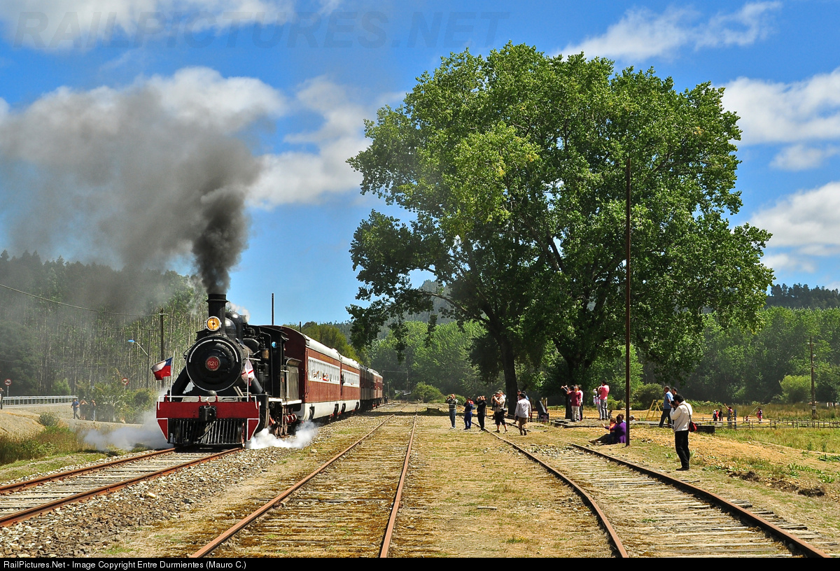| Beautiful day in Los Rios district, departure of the former railway station in Pishuinco village, after a brief detention of heritage and tourist train "Valdiviano" with the steam locomotive built by North British 2-6-0, remembering those travel through the old railway branch Antilhue - Valdivia. |