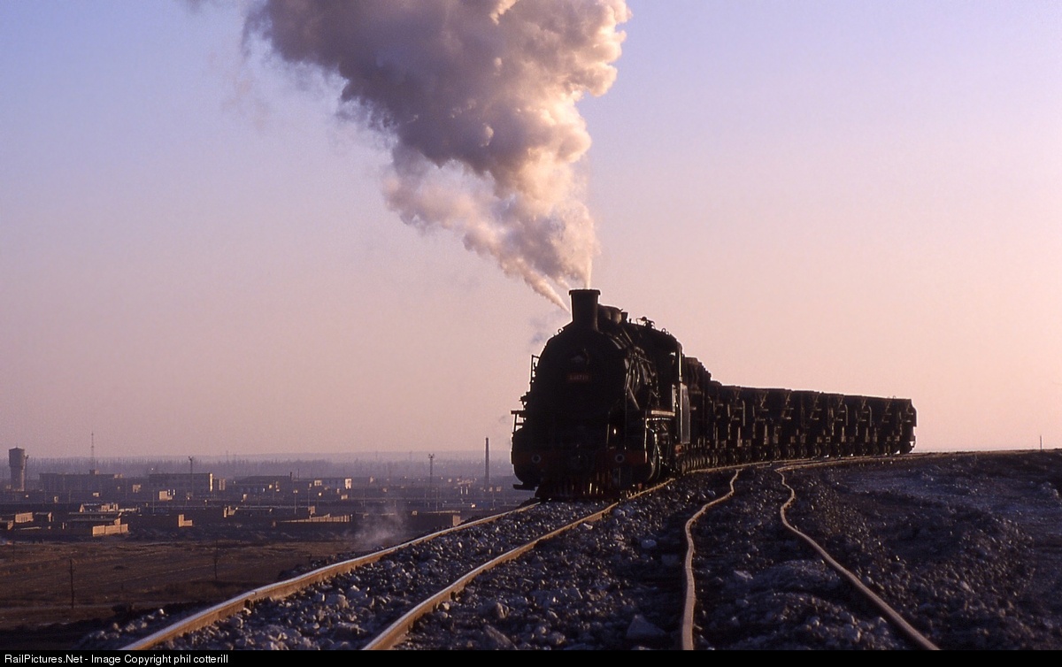 An SY class 2-8-0 travels over some dodgy looking temporary track laid on top of a slag heap at Baotou steelworks in 2001.
