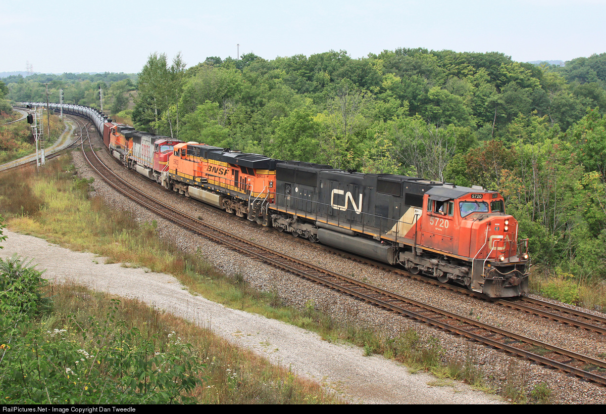 A trio of BNSF units and 100 crude loads are trailing CN 5720 at the old Hamilton West.