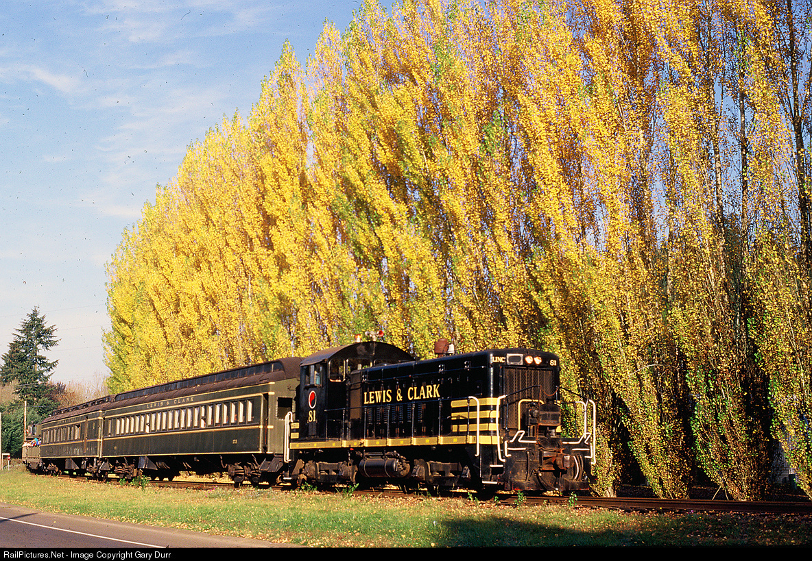 The leaves on the trees are a bright yellow as they glimmer in the afternoon sun shine, as the Lewis River dinner train rolls into Battle Ground Washington with former Southern Pacific SW-8 Now numbered LINC 81... This scene has changed very much since I took this picture... The trees and the Railroad are now gone... The tracks are still in, but have not seen a train in many years...