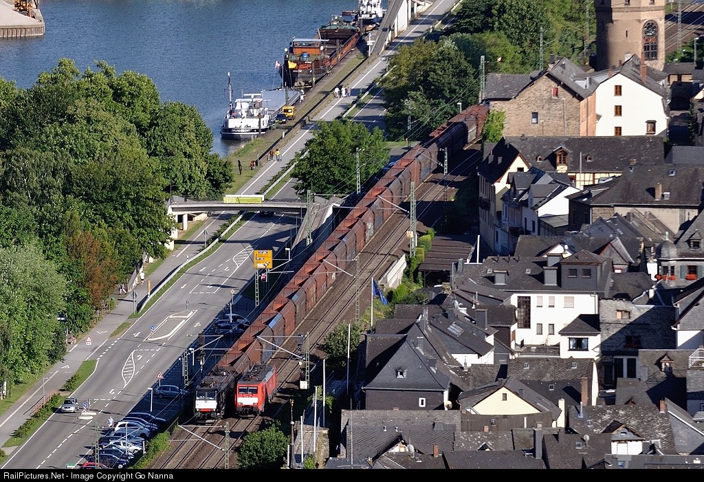 Northbound empty hopper meet a light engine move north of Oberwesel station along the Rhein river valley. Left black engine is MRCE ES64 F4 and right red engine is DB Schenker 189 028-4. They are Siemens ES 64 F4 brothers. Behind the hoppers is connected NIAG 2 diesel engine(Vossloh G 1700-2 BB). I was lucky to meet this rich scene.