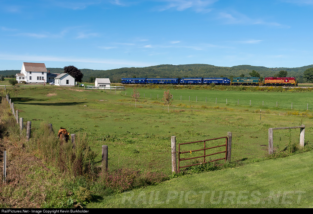 Pan Am Railway's Office Car Special train is seen rolling through rural Vernon, VT with B&M Heritage GP9 77 and Maine Central Heritage GP9 52 leading the PAR-1 and PAR-2 FP9s and OCS train for the trip back to East Deerfield, MA following the Glory Days Festival in town.