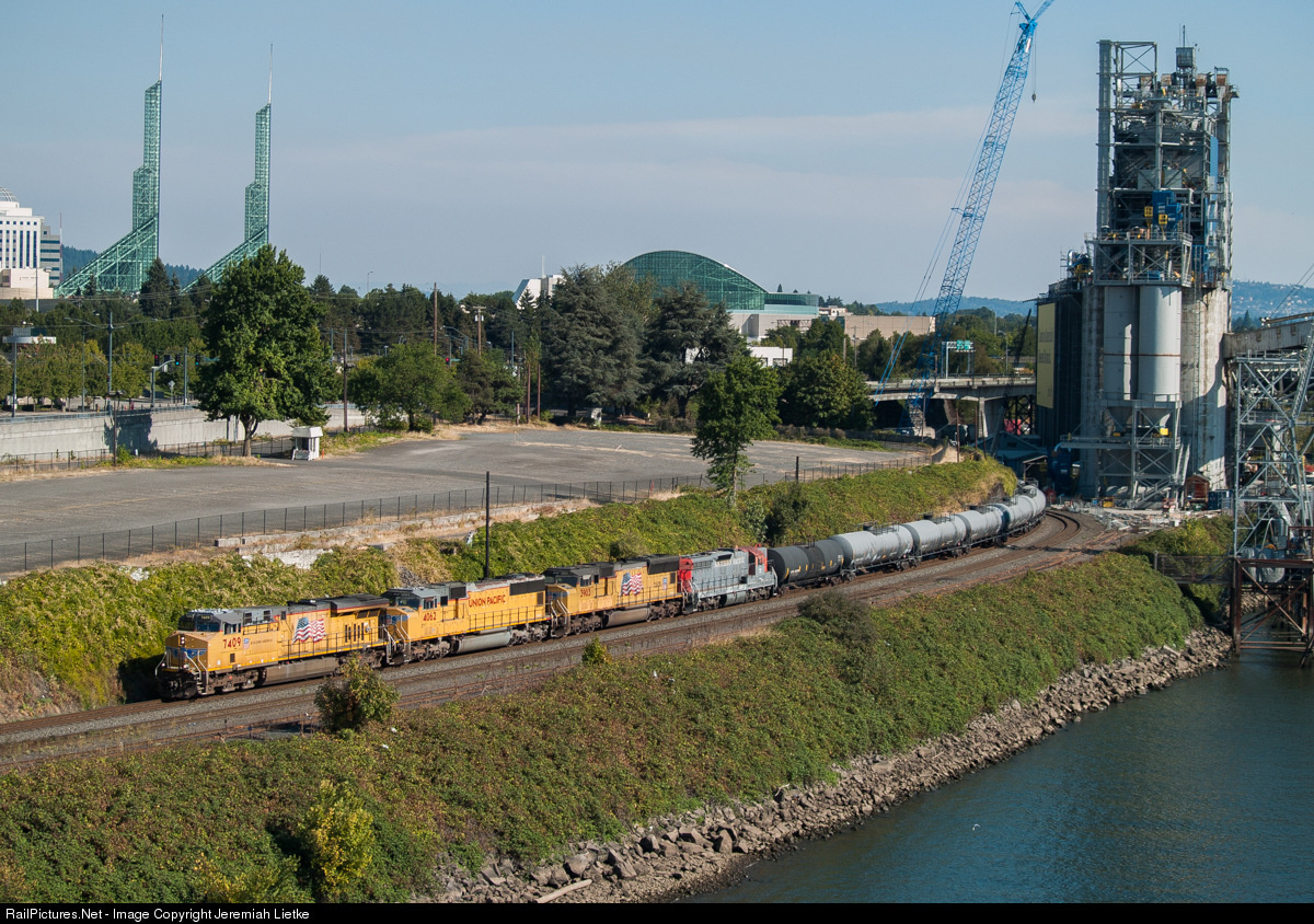 A Union Pacific manifest creeps westward along the Willamette River as it heads towards Albina Yard to wait behind an intermodal. The fourth unit is Ex. SP (now WRIX) 4404, which used to be a piece of the Western Railway Museum collection down in Portola, California. Now, it is headed off to Airway Heights, Washington, where it will become a leaser for Western Rail.