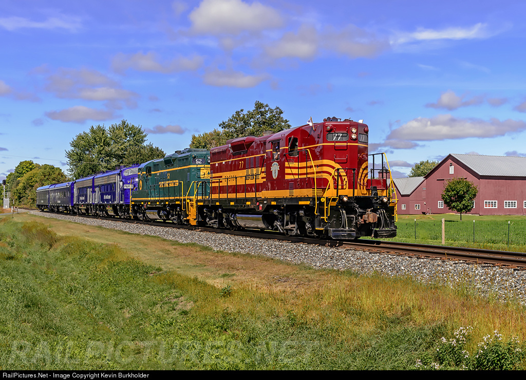 | Pan Am Railway's Office Car Special train is southbound on the NECR Roxbury Subdivision rolling along the Connecticut River through the rural part of Windsor, Vermont, with B&M Heritage GP9 77 and Maine Central Heritage GP9 52 leading the PAR-1 and PAR-2 FP9s and OCS train for the trip back to East Deerfield, MA following the Glory Days Festival in town. |