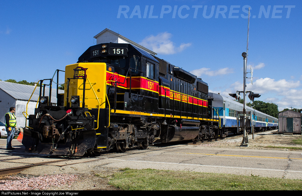 On Saturday, September 13th, 2014, the Iowa Interstate Railroad made four round trips between Henry, IL and Chillicothe, IL running a special 8-car passenger excursion for the families, railfans and public volunteers of the area to ride. The train was consisted of two IAIS SD38-2's, 151 and 154, bracketing eight ex-Montreal Commuter cars. Here we see the 151 unit slowly being drug behind the IAIS 154 as it enters the small town of Henry after its first complete trip, getting ready to make passenger pick-ups and drop-offs. Note the IAIS employee flagging the grade crossing the the left of the photo.