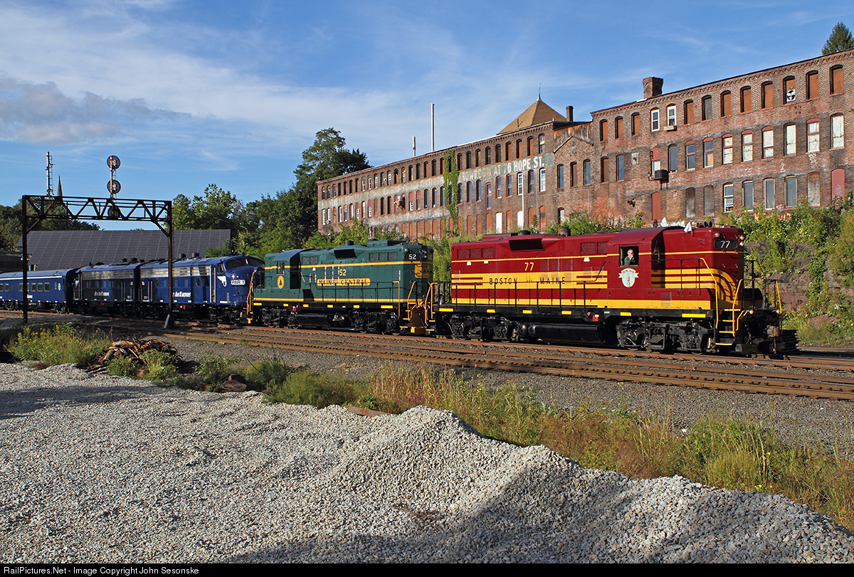 Pan Am Railways Boston & Maine and Maine Central heritage units are returning SB from the Annual White River Jct. Glory Days Festival as they roll through Greenfield on the last mile into East Deerfield.