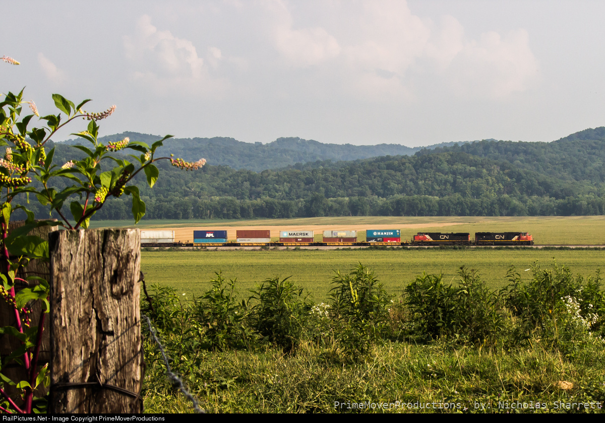 A pair of CN locomotives power Norfolk Southern's 236, a daily intermodal train from Columbus, Ohio to Norfolk, Virginia east at Waverly, Ohio. The locomotives were a rare sight in Ohio's Scioto River Valley as they travel along the Columbus Division.