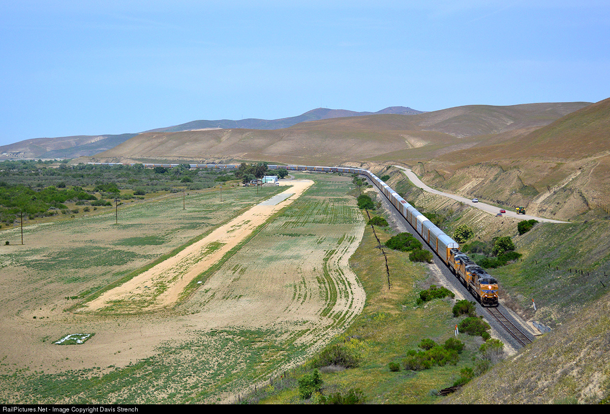 While regular freight traffic has pretty much dried up on the Coast Sub, UP is occasionally routing some "Repo" auto rack trains down it to LA and then from there to points East. Here is one of such trains, running from Milpitas, CA to Nogales, AZ.