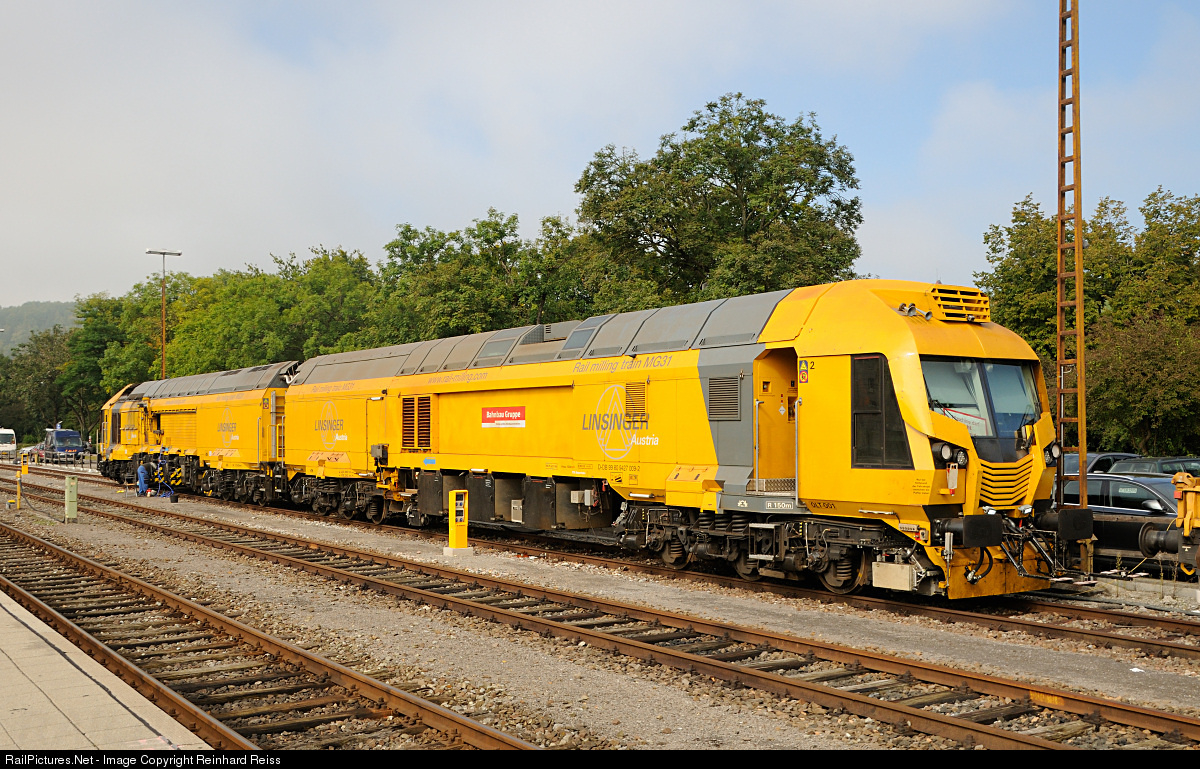 | Rail milling train MG 31, built by Linsinger, Austria and owned by DB Bahnbau. This self-propelling machine is for reprofiling and grinding rails, equipped with three milling units (left/right) and one grinding unit (also for left and right rail). |