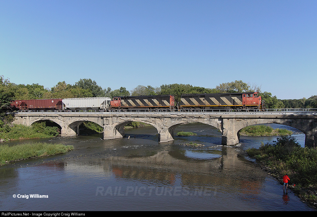 The Cedar River Local is on the way south to Waterloo with 73 cars. Here the job passes over the Cedar River as a fisherman enjoys a nice afternoon.