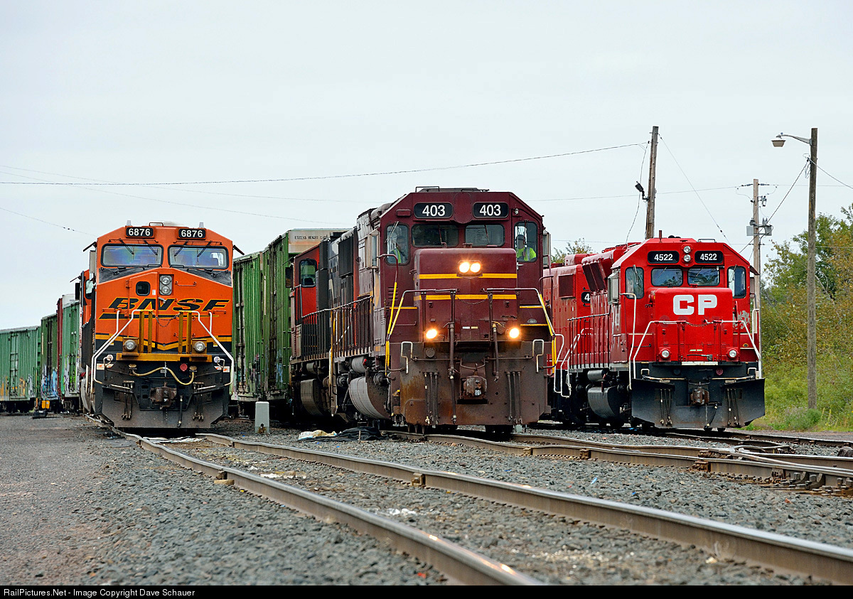 | Despite the gloomy day a couple of unusual visitors to CP's Stinson Yard provide for an interesting image. A pair of BNSF GEs are working on the CP and brought up a train from St. Paul while DM&IR 403 is leading a CN transfer back to their nearby Pokegama Yard. The 403 is a rare animal here as it usually works ore trains across the bay in Minnesota. |