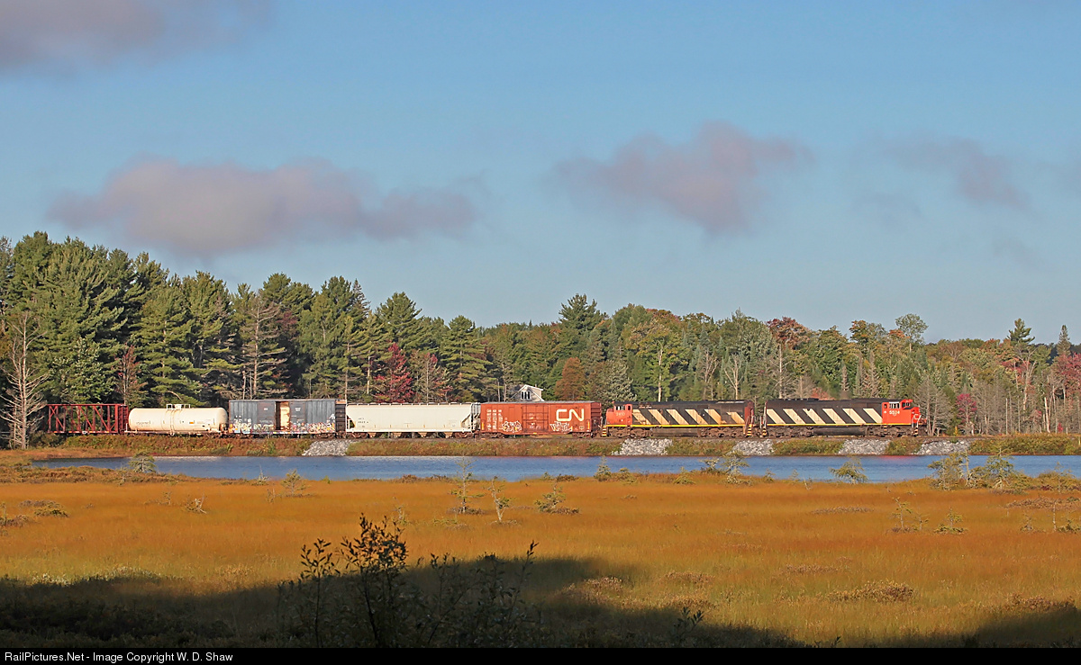 CN 451 steps out into the morning sun and on to the causeway that separates this southern tip of Siding Lake from its main body. It's a chilly September morning and signs of fall are starting to appear. The lead unit has been causing problems and the crew had to stop the train at Falkenburg to isolate it. They were able to restore it to normal a short time later, but had to isolate it again before getting up to this point, and will be putting in another call to the Diesel Doctor once they reach Huntsville.