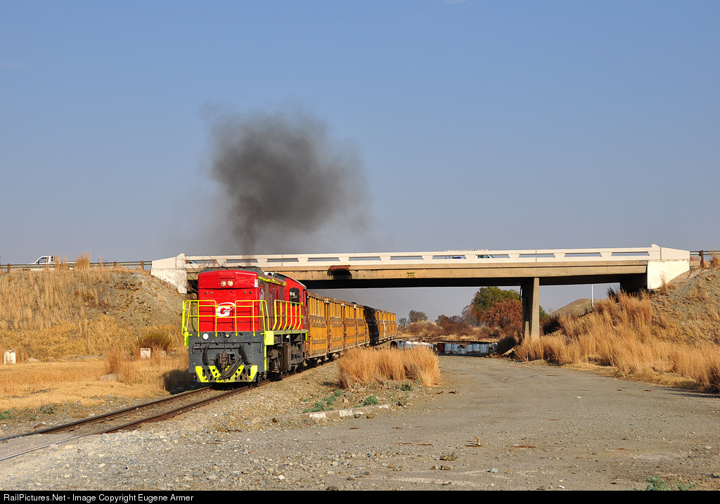 | An Australian in South Africa.....this ex-Queensland Railways class 1720 Clyde GL18C Co-Co now belongs to RRL Grindrod and is currently based at Welkom to work the Harmony Gold ore traffic. On a sunny winter morning, no. 1762 ducks under the R30 road bridge, hauling a loaded train from Nyala shaft over mine trackage to Friedesheim. From there it will continue on Transnet Freight Rail tracks to Welkom. |
