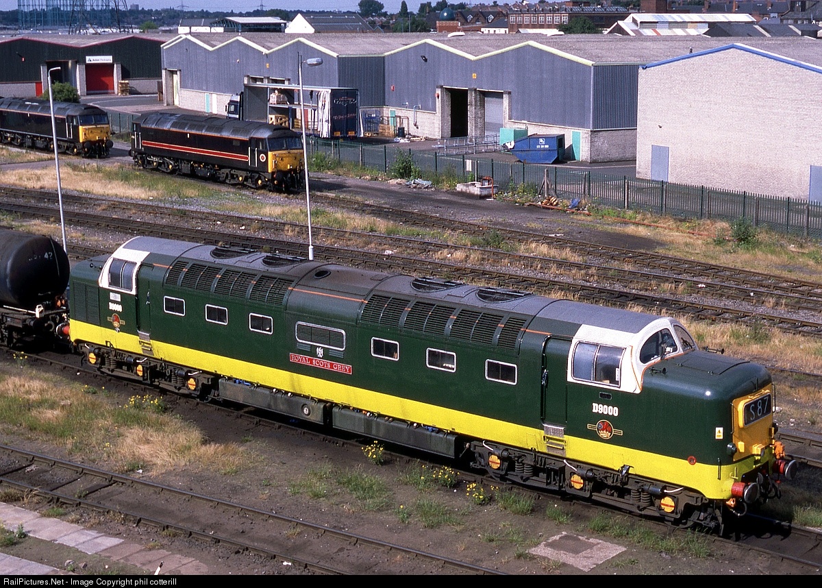 | My personal favourite class of diesel loco on British Rail is the class 55 Deltic. 22 were built for express passenger work on the East coast main line. They retired at the start of 1982. However, in 1999 Virgin Trains was hiring D9000 for a regular Birmingham to Ramsgate train on summer Saturdays. It is seen here on Saltley depot in Birmingham on a Tuesday in 1999. |