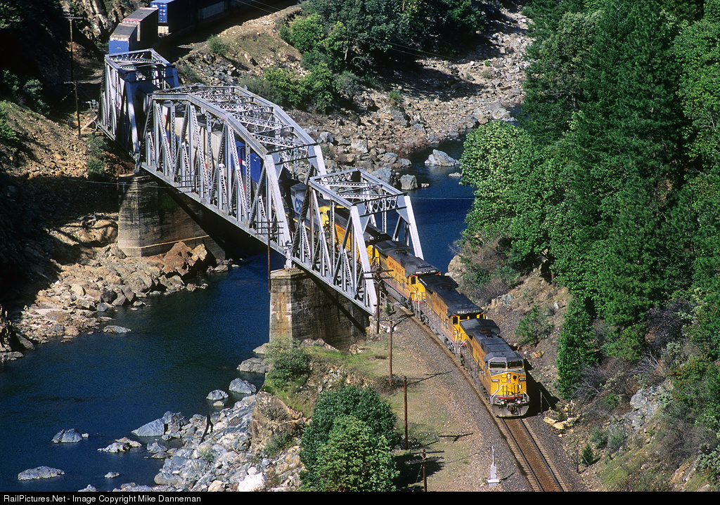 | A westbound Union Pacific stack train crosses the Feather River at Pulga, California, on March 12, 2000. |