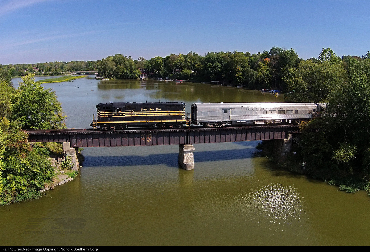 Nickel Plate Road GP7 number 426 leads an Indiana Transportation Museum excursion train across the Morse Reservoir in Cicero, Indiana. ITM operates a former Norfolk Southern (originally NKP) branch between Tipton and Indianapolis, with most excursions based out of Fishers. The Museum itself is within Forest Park in Noblesville. Visit http://itm.org/ for more information about the Museum and its excursions. Photo by Casey Thomason. For more information about Norfolk Southern, visit www.nscorp.com
