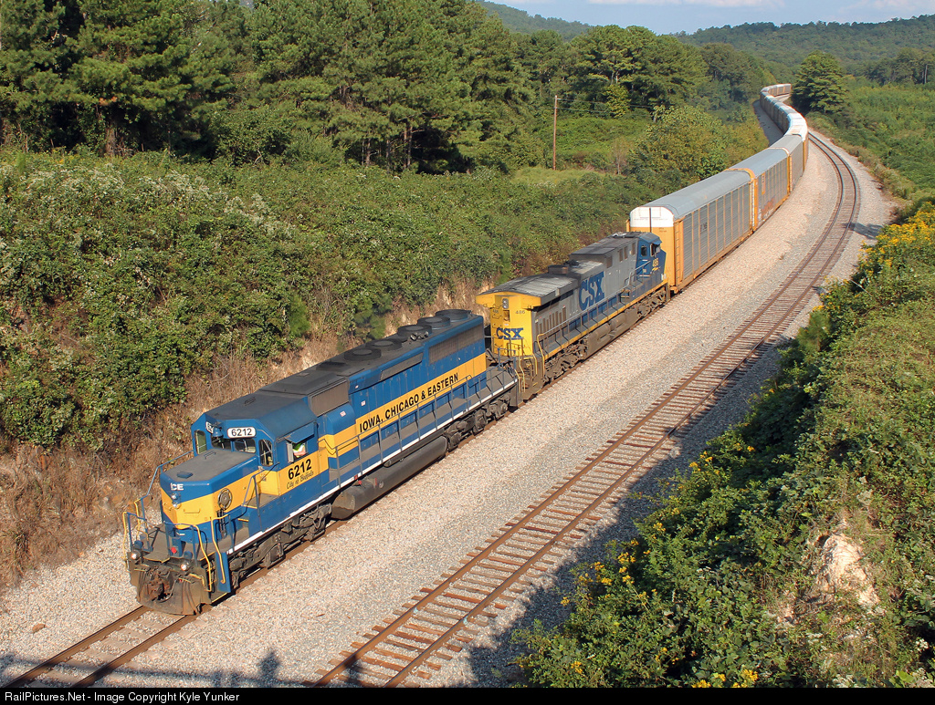 Engineer Devlin has the throttle wide open aboard ICE snoot nose SD40-2 #6212 as it leads CSX empty autorack train Q210 doing every bit of 60mph on their way to Chattanooga.