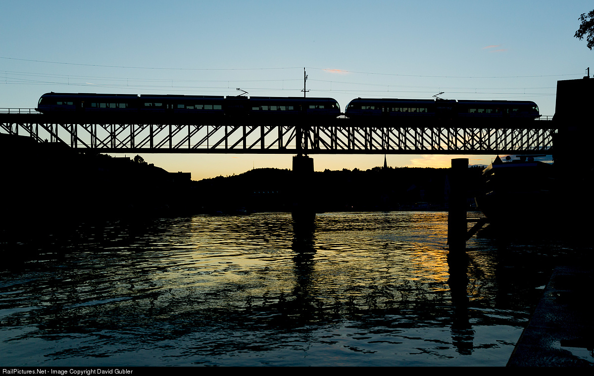 Two GTW units (a 2/8 and a 2/6) cross the Rhine bridge at Feuerthalen a few minutes after sundown.