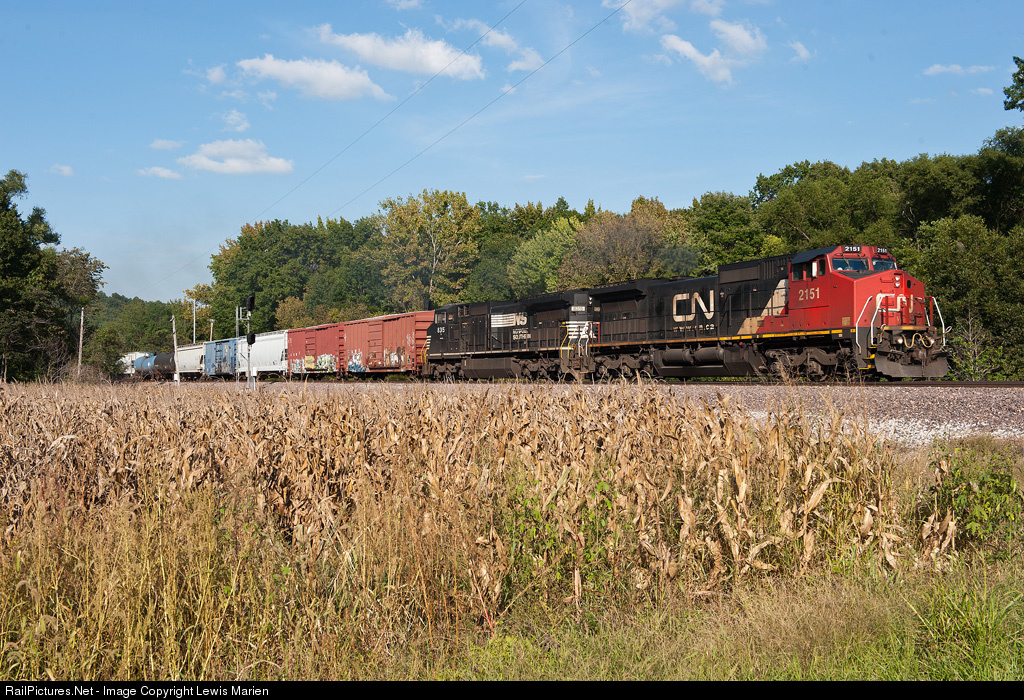 Sporting an ex-Atchison, Topeka & Santa Fe Warbonnet now in Canadian National paint, a manifest for Pine Bluff, Ark., that came off the Norfolk Southern at Sidney, Ill., rolls down through rural southern Illinois on Union Pacific's Mount Vernon Subdivision, September 19, 2014.