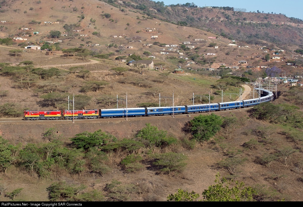 | After a quick weekend visit to the east coast city of Durban, 18-802 / 18-807 are seen winding their way through the rural hills of the Shongweni / Cliffdale area on their return journey to Pretoria with the Blue Train. |