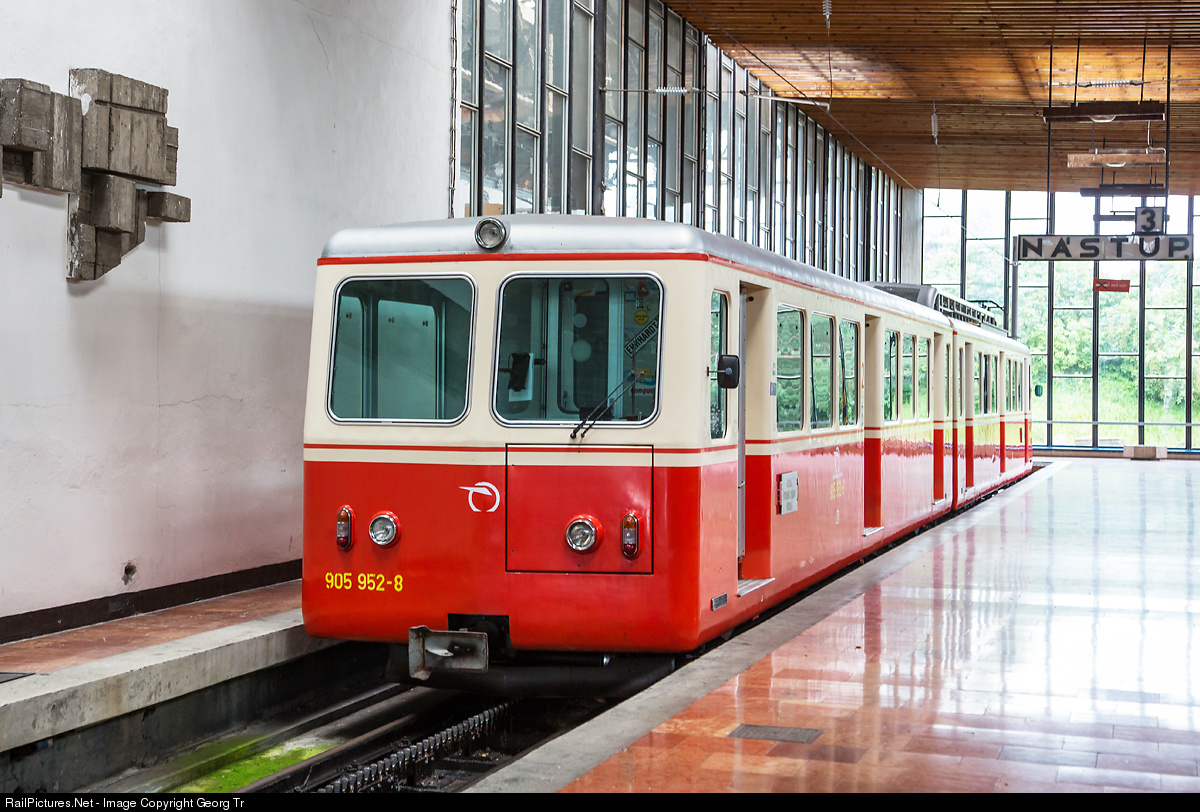 | Cab car 905.952 and electric cogwheel railcar 405.952 of the 1 meter gauge mountain railway from Štrba to Štrbské Pleso. This vehicles were built by SLM Winterthur and BBC Baden in Switzerland in 1970. |