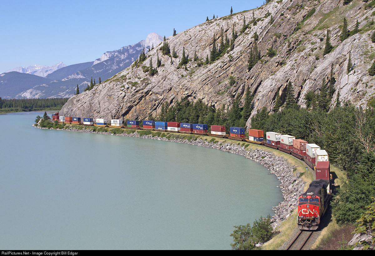 CN train 101 heads west along the Athabasca River with DPU CN 2236 giving a shove on the rear. The train has just exited Parkgate Tunnel at milepost 205 and will access double track around the corner at Parkgate. This is about 25 miles east of Jasper.
