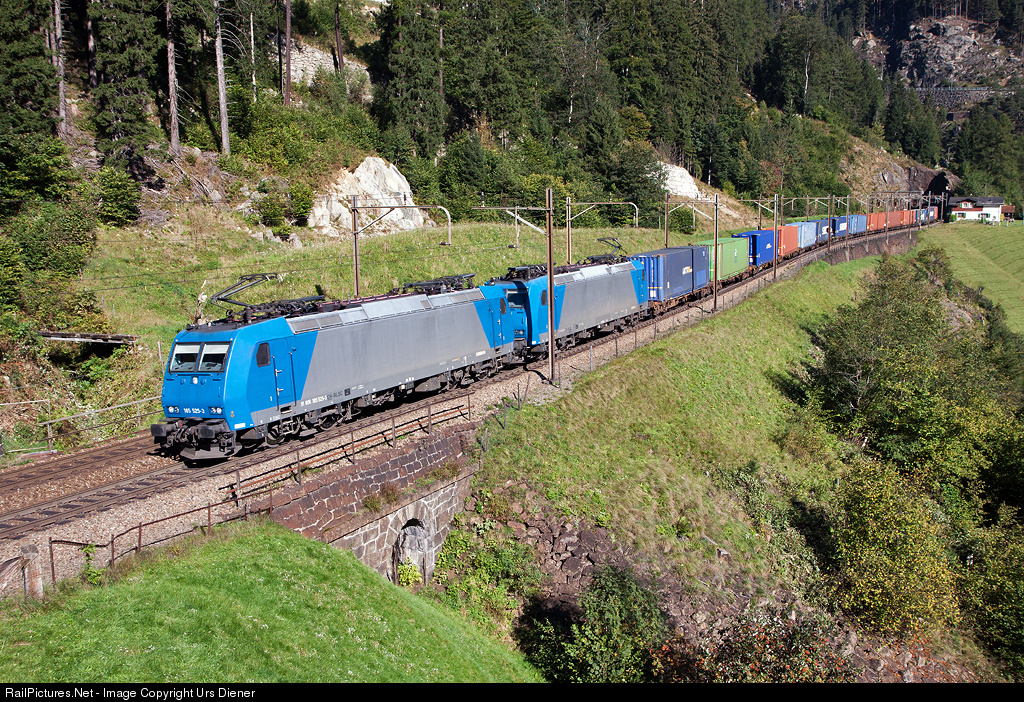 | BLS 185 525 and 185 527, both hired from Alpha Trains, pulling a container train on the Gotthard north ramp. |