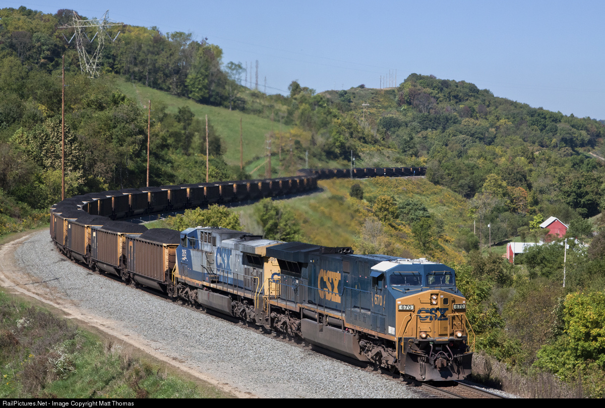 An early fall day finds two CSX loco's pulling hard on a long string of coal loads out of CONSOL Energy’s Bailey Mine on Norfolk Southern's Manor Branch in Greene County Pennsylvania. Beyond the tree line are a set on NS locos pushing hard to get this train out of the hole.