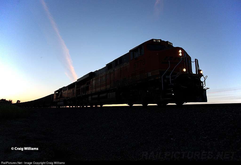 A loaded coal train from Black Thunder Mine, WY, to Gateway, IA, is working across southern Iowa enroute to Burlington at sunset. At Burlington the train will take the Hannibal Sub to Montrose where the coal will be unloaded and barged north on the Mississippi River to a power plant.