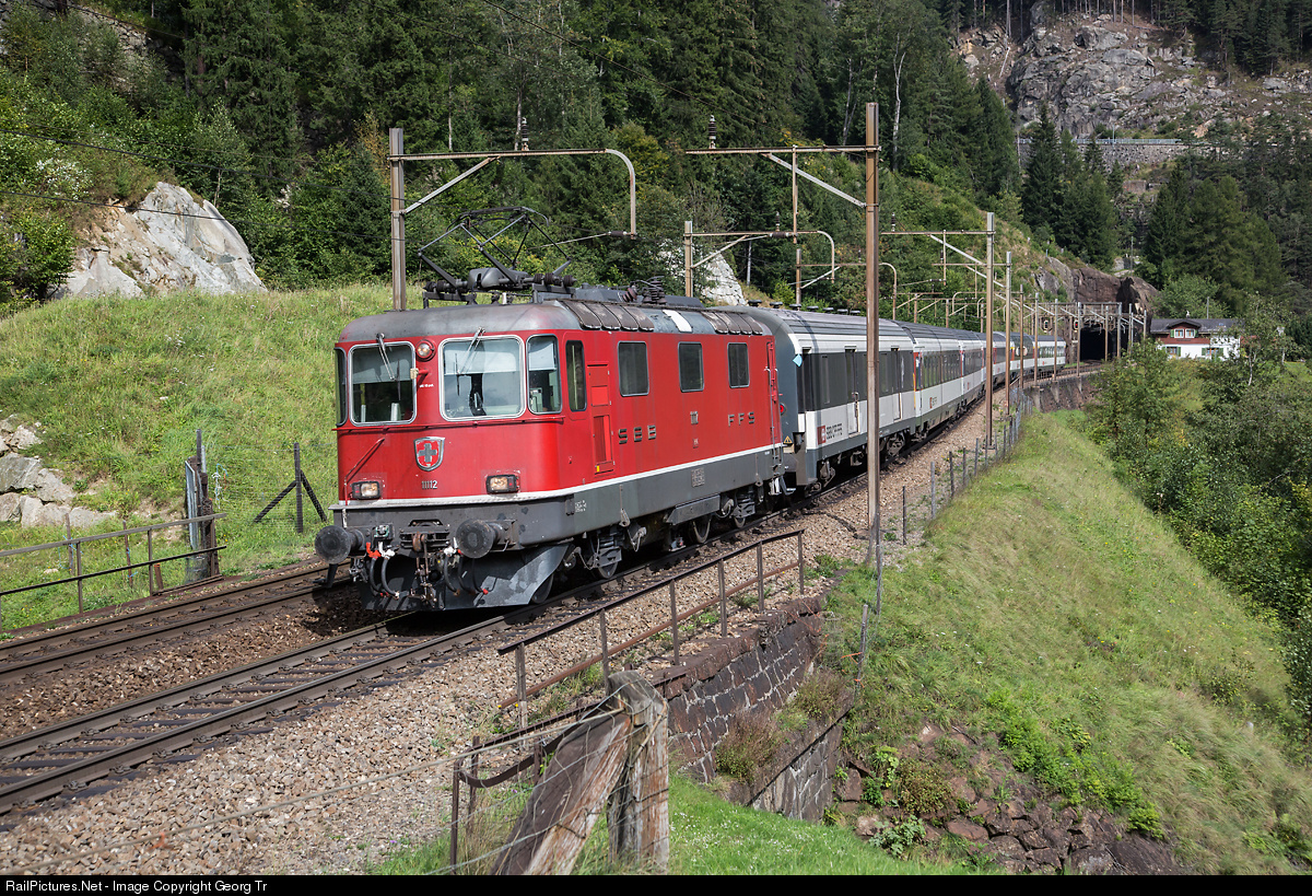 | Re 4/4 II # 11112, one of the oldest operational of the series and only weeks after a revison R1 with upgrade to 18-wire UIC-line, is pulling InterRegio 2267 on the uppermost level of the loops of Wassen. |