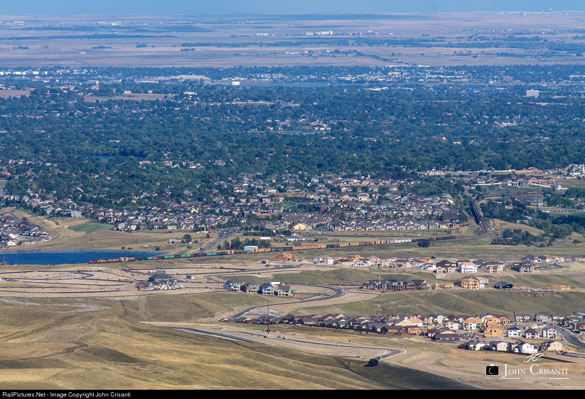 Overlooking the Denver Metro Area, two trains can be seen over five miles away or eight rail miles away at Leyden near Arvada. The North Yard - Roper Yard manifest is seen heading west at Chemical after meeting a coal load at Leyden that will be getting the light to head into Denver.