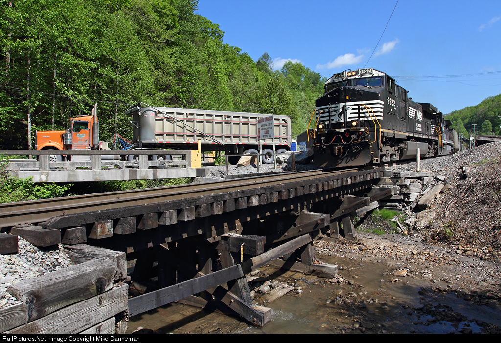 With a coal truck passing in the background, Norfolk Southern C40-9W No. 9922 is about to cross a small wood trestle while loading a 105-car unit coal train at Alpha Natural Resources’ mine on NS’s former Interstate Stonega Branch at Wentz, Virginia, on May 12, 2014.