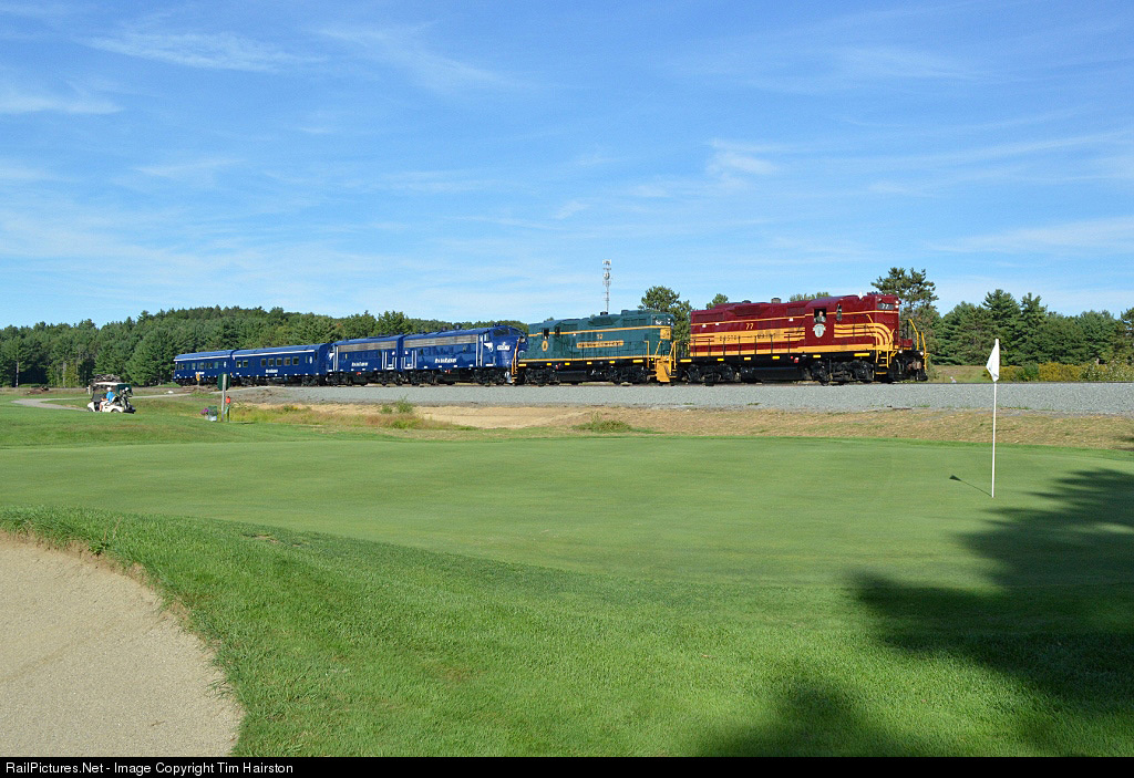 Pan Am's Office Car Special, lead by GP9s 77 and 52 in Boston & Maine and Maine Central heritage paint respectively, heads south through the Greenfield Country Club in Greenfield, MA, on the Conn River Main. The equipment is returning from White River Junction, VT where it was on display for the towns 22nd annual "Glory Days" festival.