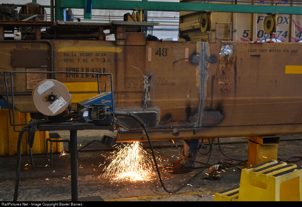 TTX is rebuilding many of their 48 foot well cars to 40 foot cars at their shops in Jacksonville, FL. Here is a shot I took of an employee welding the ends back to the middle while on a tour of the facility with the Florida East Coast Railway Society.