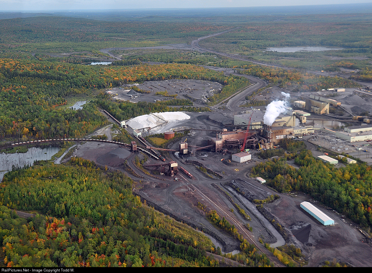 | Looking south east from above the Laurentian Divide at Arcelor Mittal’s Minorca Mine processing plant. Right side is the rail line into the facility. Upper right is the tailings pond, upper center is the haul road from the mine which is near Biwabik/ McKinley ( where those faint water towers are and about 10 miles away). A limestone train is in the process of delivering said product and a few bentonite hoppers are visible as well. The plant is humming along making pellets on this Saturday afternoon. |
