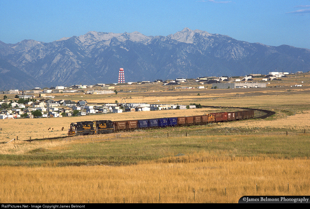 Rio Grande GP40-2s 3096 and 3110 pull a 16 car Midvale Tramp through the outskirts of Magna on August 2, 1994. The 6,700 ft. wall of the Wasatch Front towers above the Salt Lake Valley including 11,253 ft. Lone Peak. If you look closely, one patch of snow has survived into mid summer above Little Cottonwood Canyon.