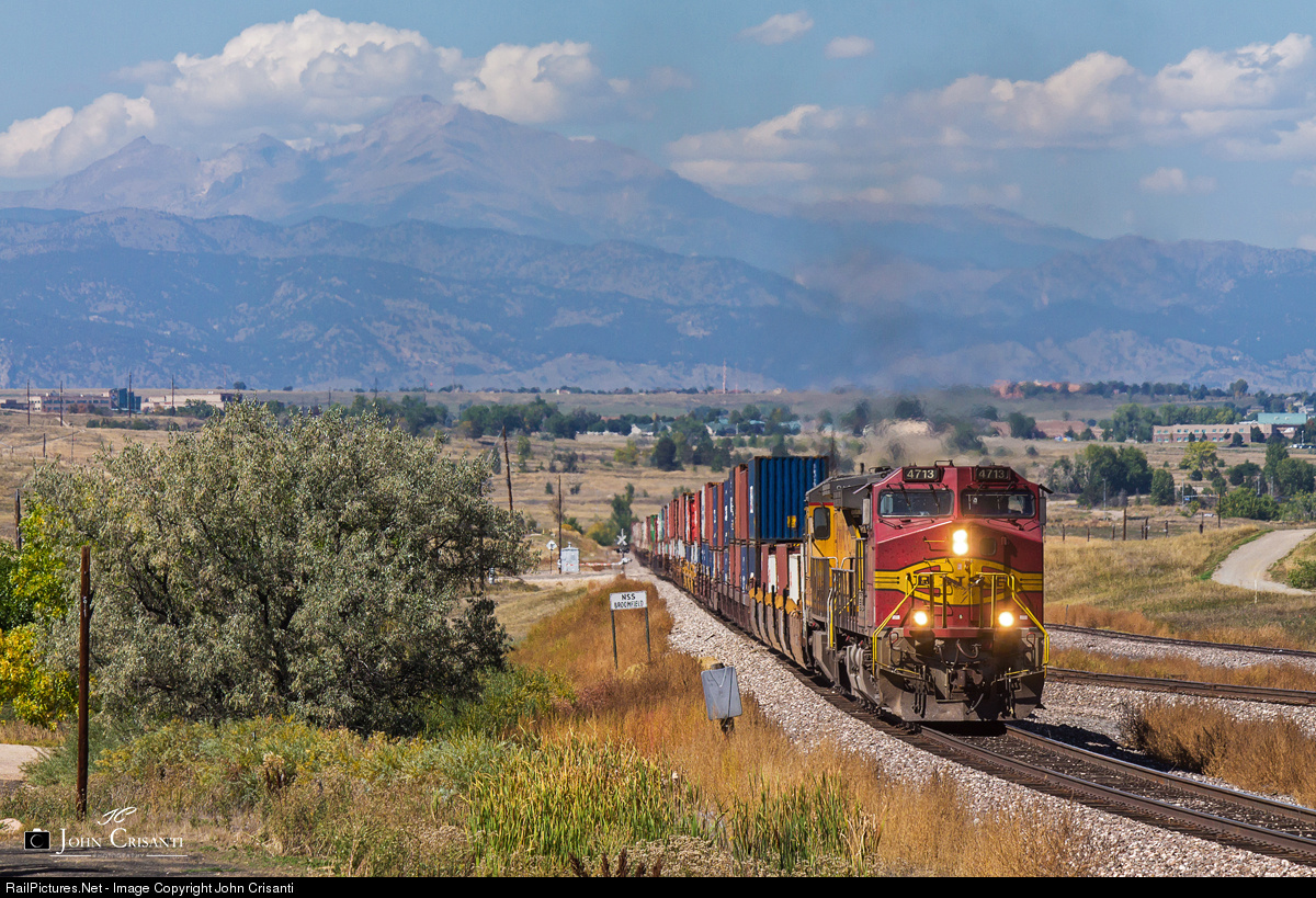 | A Warbonnet BNSF C44-9W no. 4713 and Union Pacific C40-8 no. 9188 lead the Tacoma, WA to Omaha, NE stack train at Broomfield. The train has just started up once again after getting fueled before going into Denver. |