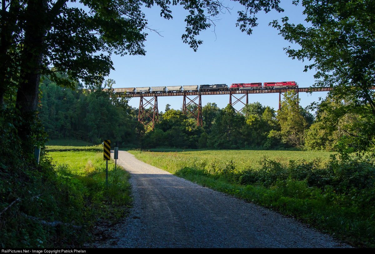 | Indiana Rail Road's HWSA proceeds northbound across the impressive 2,295 foot long, 157 foot tall Tulip Viaduct. Completed in 1906, this structure still sees multiple INRD movements every day and stands in stark contrast to the bucolic farm scenery in this region of the state. |