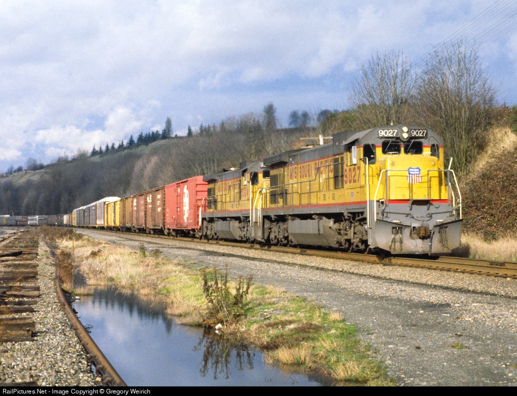 | Two Missouri Pacific lettered UP C36-7's lead a Seattle, WA to Hinkle, OR freight South. |