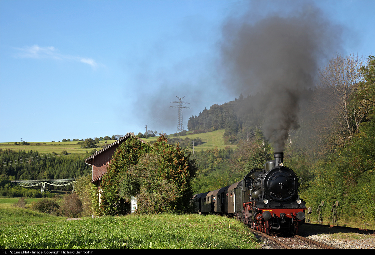 | P 8 2455 is pulling the afternoon train on the Sauschwänzlebahn. On the left there is the Biesenbachviaduct.