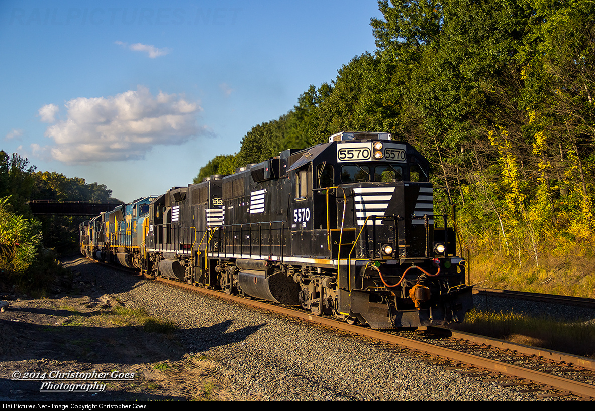| Behind the Q372 was this monster of a lash-up Q384 with leasers FURX 5570 & 5554 both ex. NS and they were screaming when they went by, it was great to see. This was another first time for me, until I saw these GP38-2's, I had never seen anything smaller than a 6 axle foreign power engine lead on CSX. |