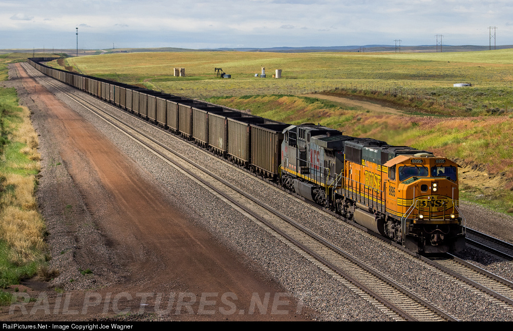 | Approaching the "town" of Bill, WY, a long northbound empty coal train races up BNSF Orin Subdivision main track two on its way to the mines for loading. The train is sporting a neat duo power including a BNSF SD70MAC and even a KCS de Mexico AC4400CW, a rare visitor to this part of the country. |