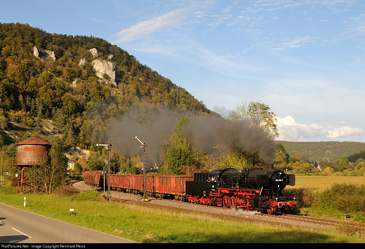 | 052 988-5 from WTB heads a special charter train out of Hausen im Tal. This station is still equipped with water tower (out of service) and semaphores (still in use). |