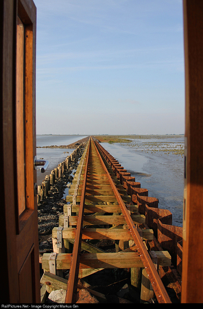 View through the open door at the rear of the Lorenbahn (light railway) on the dam between Dagebüll on the mainland and the island Hallig Oland in the evening sun. At this part the rails are on spiles, it's called Fuchsfalle (fox trap). The sign and the comments for the foxes you see and read on http://www.railpictures.net/viewphoto.php?id=499234&nseq=17