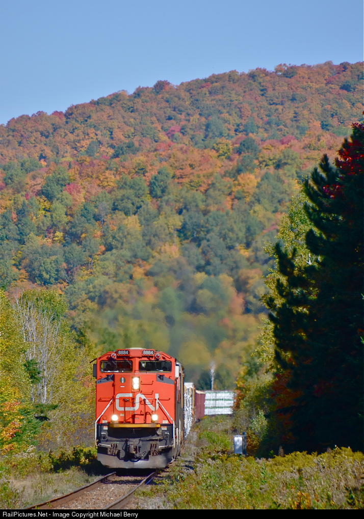 | Dwarfed by fall colours. CN 369 heads south on the Lac St-Jean sub with with three head end units (CN 8884, CN 2024 and CN 2340) and two more mid-train (CN 5765 & CN 2267). It is passing through Rousseau. |